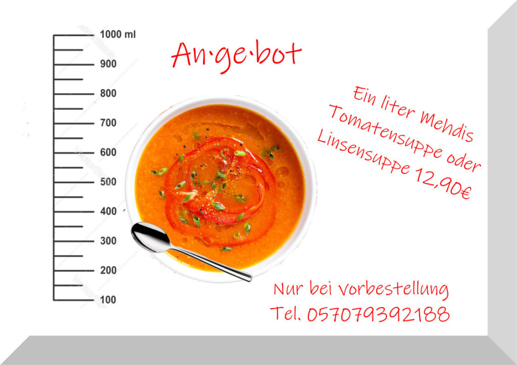Hilft gegen Erkältungen und Grippe (Angebot: einen Liter Suppe für 12,90€) Gerne eigenes Geschirr mitbringen!